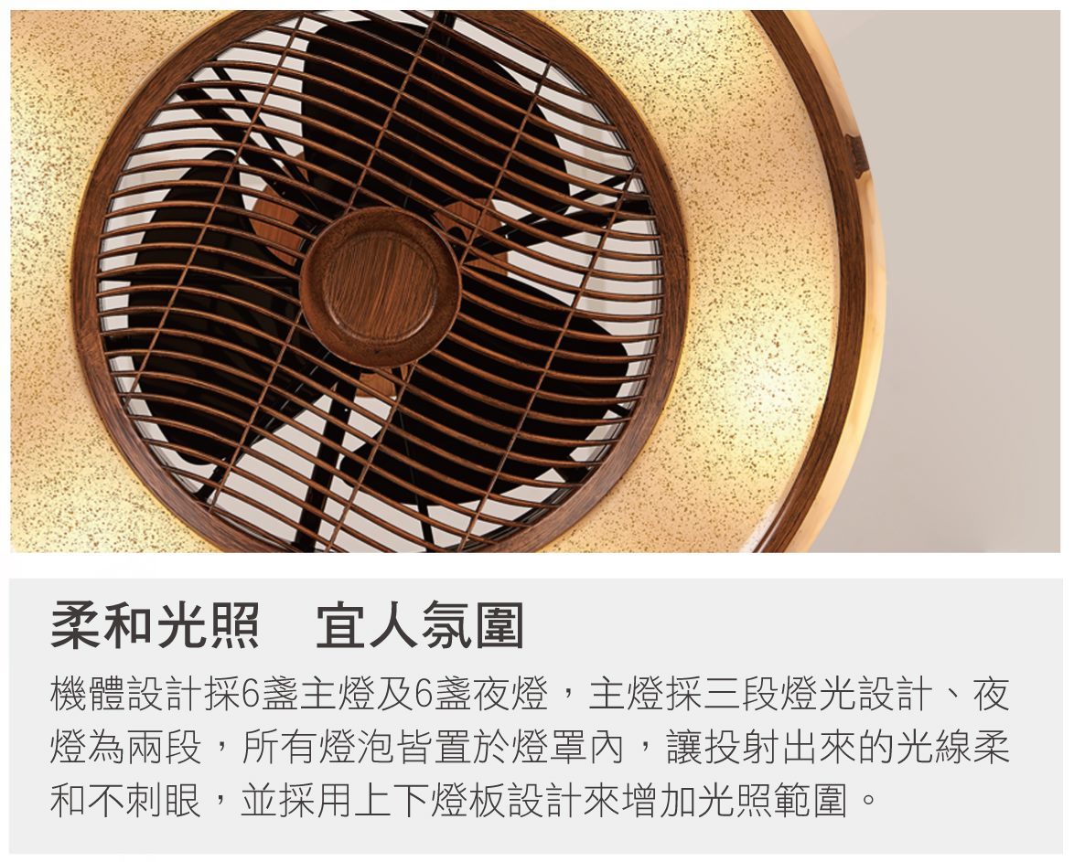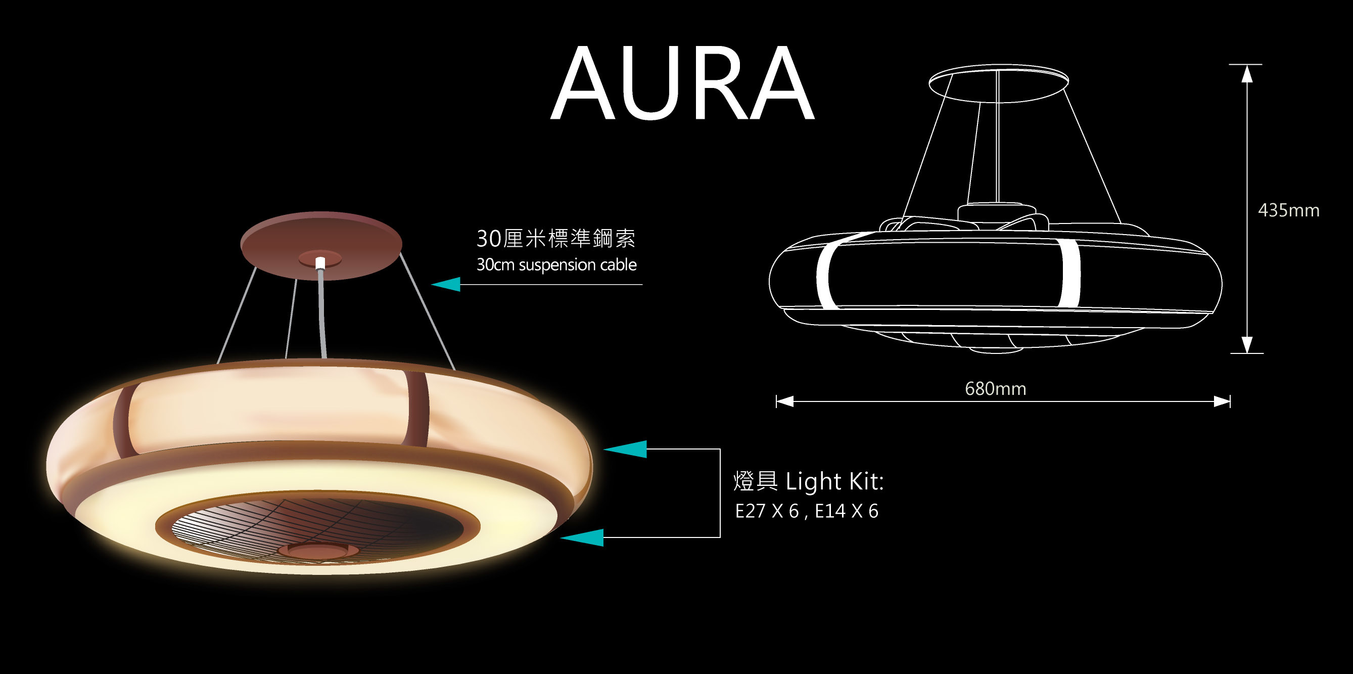 Designed for Living room & Bedroom Model : Aura • Steel made cable for a quick installation and safety structure, can bear max.100 kg • Fan diameter of 26 inches with hidden blades, suitable for installation in small spaces • The body is designed with six main lights and six night lights • Use replaceable bulbs : E12 X 6 and E27 X 6 • Adjustable three airflow speeds • Rotating wheel to bring the wind over the space |
