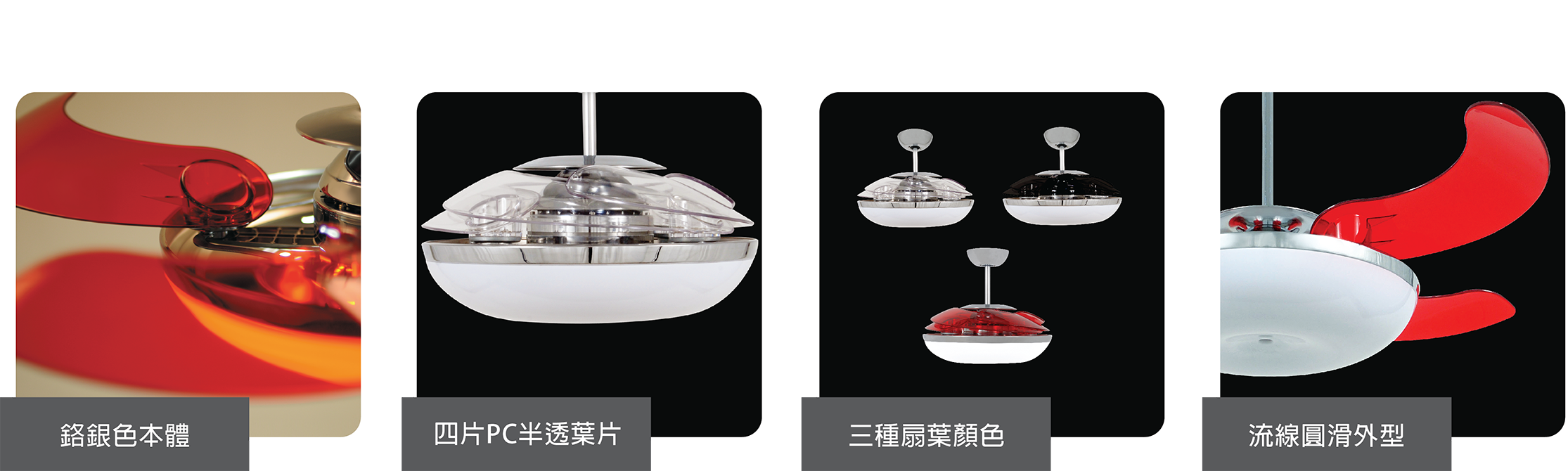 Product dimension : 46" , W 114.2 X H 39 cm Material : four (PC) translucent plastic blades Housing Color : chrome Blade color : translucent red / clear / translucent black Light Kit : T5 40W circular lamp X 1 |
