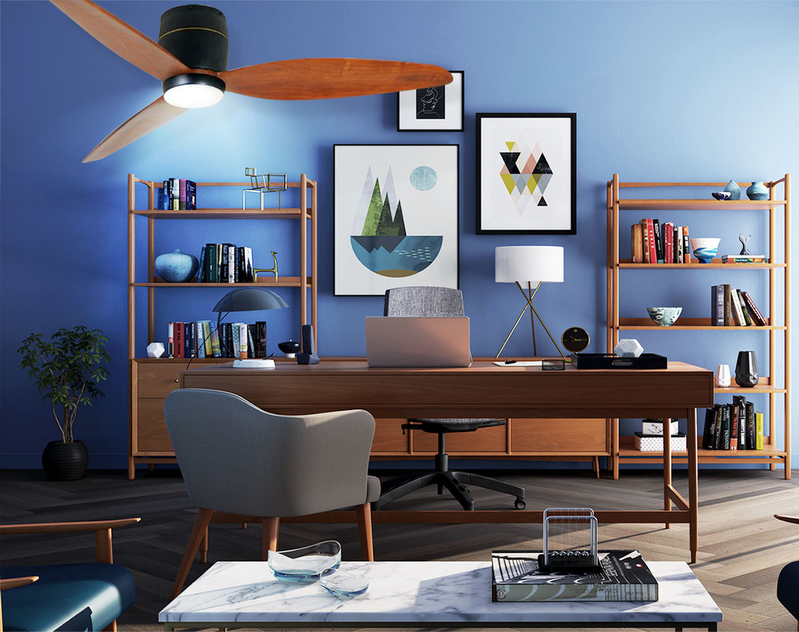 Designed for Living room & Bedroom Model : 36" / 42" / 54" Samara • Special design for low ceiling : height of housing is under 10" • 3 pieces of blades • 3 speeds control • Built in LED 18W warm white light source , durable and even light distribution • DC brushless motor , Low power consumption and energy saving |