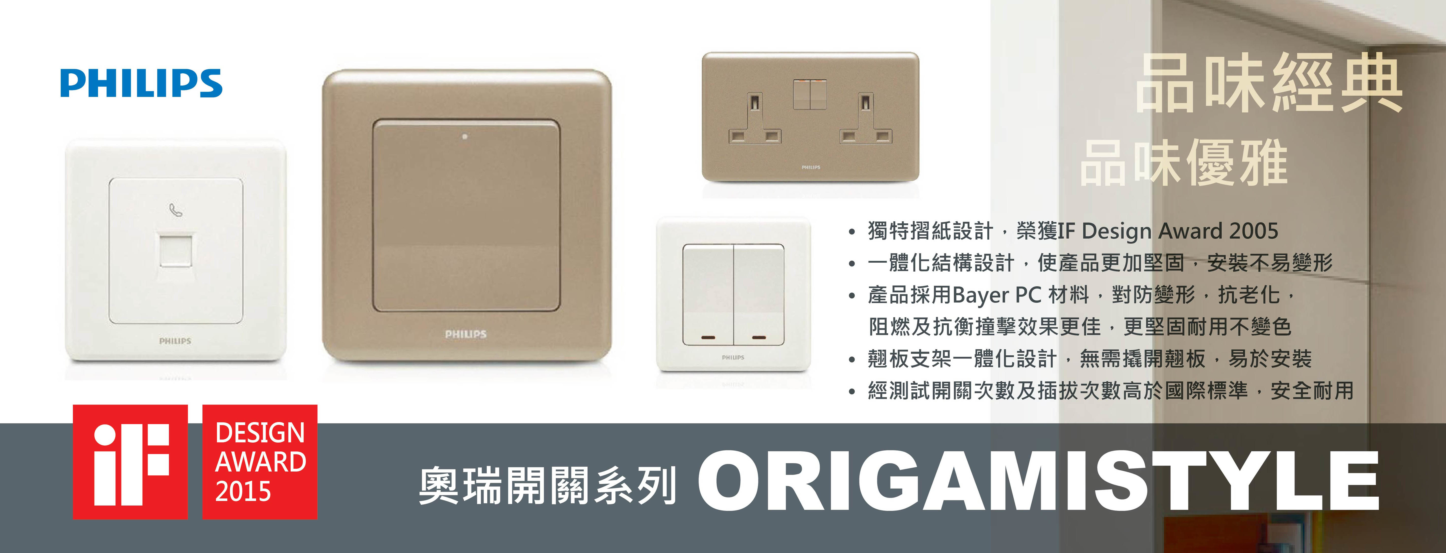 ORIGAMI 意為 "摺紙",其設計靈感源於對中國傳統摺紙藝術的詮釋。簡約大氣的外觀下,一條折痕下將平面的翹板開關變得立體。