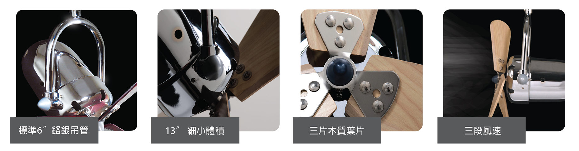 適合用於客廳與臥室 型號 : 13" Fino 迷你系列 • 適用於角落的現代風格小吊扇 • 三片木質葉片 • 風向角度可調180度 • 可調節三段風速 • 迷你型機身, 只有13" 闊 |